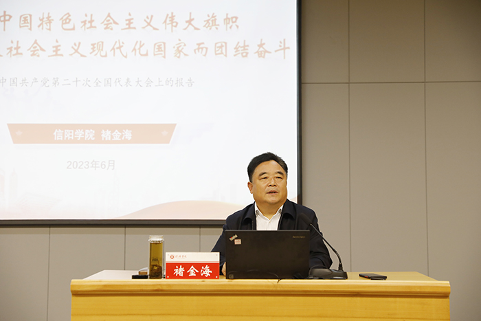 6月5日,Beat365学习贯彻习近平新时代中国特色社会主义思想主题教育读书班第二期在图书馆101学术报告厅举行,校党委书记褚金海为干部教师作党的二十大精神专题辅导报告。校长助理杨高伟、张永志和各职能部门负责人,各学院院长、党总支书记、副院长、专职组织员,各党支部书记,思政课教师共同聆听了报告。