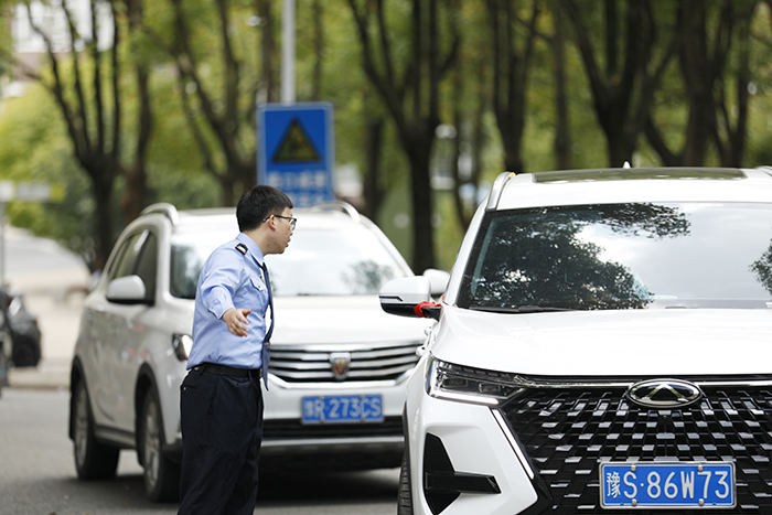 校外青树挺拔,校内绿草如茵,在风景如画的信院里随处可见校园护卫队的身影。他们身穿校园护卫队特有的服装,担起了校园护卫队的责任。提前摆放交通指示牌、在各个主干道执勤站岗,他们以最大的热情为“小23”们答疑解惑、指引道路。在车流量较大时,他们坚守岗位,指挥交通,保障道路通畅,确保迎新工作的顺利进行。