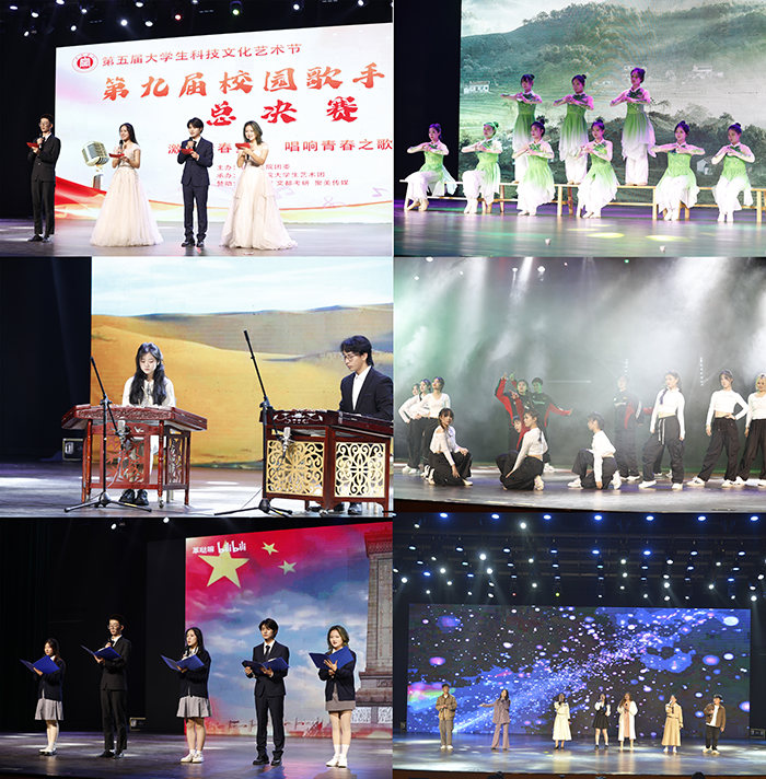 第八届校园歌手大赛“十佳歌手”的激情演唱拉开了比赛序幕。随后,15名选手按照抽签顺序,用动听的歌声和不俗的舞台表现,诠释着青春飞扬的主题,给观众带来一场不同凡响的视听盛宴。整场比赛高潮迭起,精彩纷呈,在场观众不时爆发出阵阵掌声。期间,由大学生艺术团带来的街舞表演《EVE》炫动全场,器乐合奏《传奇》以优美的旋律、深情的演奏,让人们感受到了民族音乐的力量和美妙,民舞《茶飘香》以茶文化为背景,展现了中华民族茶文化的深厚和韵味,赢得观众阵阵喝彩。诗朗诵《青春中国》,激发了广大同学的爱国之情和报国之志。