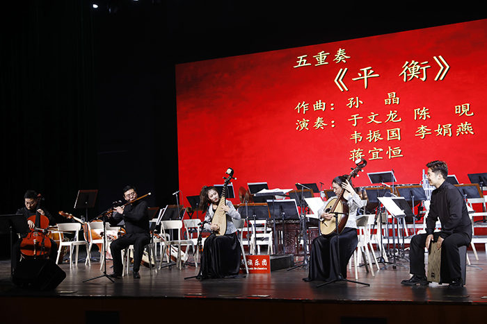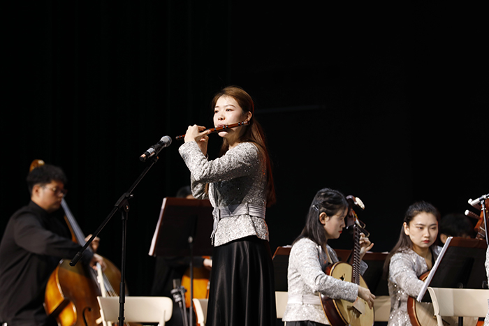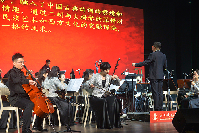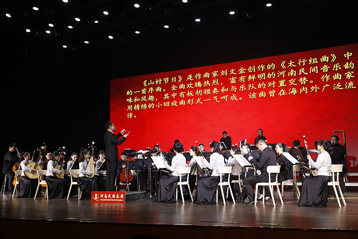 音乐会在欢腾热烈、极具喜庆气氛的民族管弦乐《山村节日》中拉开序幕。抒情柔美的民族管弦乐《彩云追月》,展现了云月相逐、相映成趣的意境之美;笛子齐奏《扬鞭催马运粮忙》以生动朴实的音乐语言,描写喜悦的丰收场景;颇具河南地方特色的民族管弦乐《豫调》给人以热情欢快、亲切清新的美好享受;民族管弦乐《郎歌》、五重奏《平衡》、中国大鼓二重奏《牛斗虎》、民族管弦乐《九百九十九朵玫瑰》时而宛转悠扬,时而慷慨激昂,曲风多样、引人入胜,观众被艺术家们的精彩演奏深深吸引,接连爆发出热烈掌声;二胡、大提琴与民族乐队合奏《菊花台》别具一格,上演了一场二胡与大提琴的深情对话;唢呐名曲《百鸟朝凤》描绘了群鸟争鸣、生机勃勃的大自然美景;民族管弦乐《瑶族舞曲》和加演曲目《花好月圆》旋律优美、律动明快,使师生深深陶醉在民族乐曲的魅力之中。音乐会在热烈的氛围中圆满落幕。