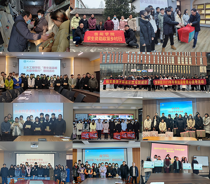 各学院开展形式多样的冬季送温暖活动。音乐学院等学院领导深入学生宿舍,走访看望困难学生,与学生亲切交谈,了解学生学业与生活上的困难,为经济困难学生发放寒冬大礼包,勉励困难学生加强自身学习,保持积极向上的心态,励志拼搏,成长成才。外国语学院开展“资助暖人心,慰问有温度”冬季走访慰问活动,到困难学生家中了解其家庭情况,促进家校良好互动,增进了师生感情。