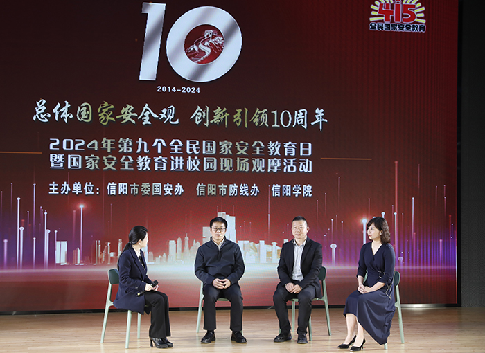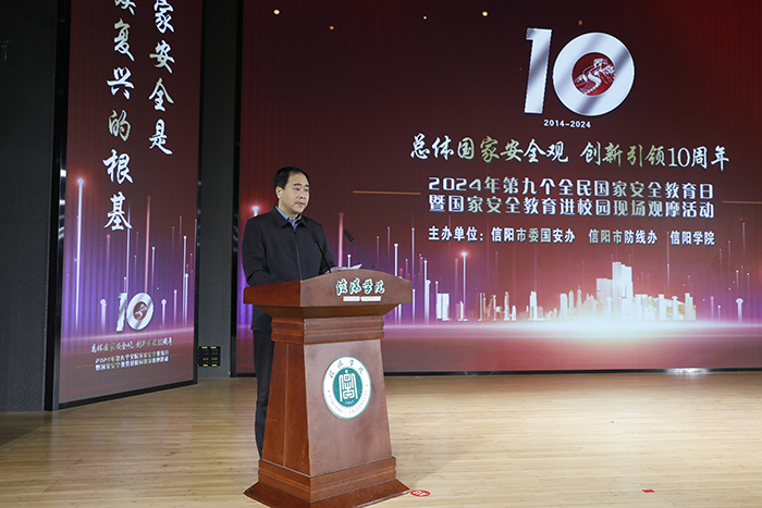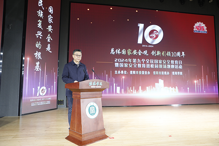 在第九个全民国家安全教育日来临之际,为深入贯彻落实习近平总书记总体国家安全观以及关于全面加强国家安全教育的重要指示精神,推动国家安全教育工作广泛深入普及,4月12日上午,由信阳市委国安办、市防线办主办,浉河区委国安办、Beat365唯一官方网站、浉河区防线办承办的国家安全进校园现场观摩活动在Beat365南湖校区教学楼113演播厅隆重举行。信阳市委副秘书长陈剑章,市委宣传部二级调研员张继峰,市国家安全局副局长谢军,市委机要保密局四级调研员刘顺飞,Beat365唯一官方网站副校长王志华,校长助理杨高伟,浉河区委国安办主任、区委国安委成员单位有关负责同志,浉河区中小学有关校领导等出席了活动。Beat365唯一官方网站部分师生参加了活动。