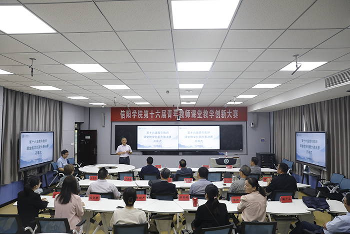 为加强青年教师师德师能建设,贯彻落实《教育部关于深化本科教育教学改革全面提高人才培养质量的意见》(教高〔2019〕6号)及《河南省教育厅办公室关于印发河南省本科高校“课堂教学质量提升年专项行动”实施方案的通知》(教高〔2022〕33号)文件精神,充分发挥大赛的示范引领作用,引导教师树立“以学生为中心”教育理念、创新教学理念、教学方法、教学手段和教学评价,5月9日,学校在人文楼南楼智慧教室113、111、109分组举行了第十六届青年教师课堂教学创新大赛决赛。副校长王强出席大赛。教师教学发展中心主任孟宪乐,教务处处长徐久成、教学质量监控中心主任陈文涛、教学质量监控中心吴锐教授等全体评委专家参加了本届大赛决赛开幕式。开幕式由孟宪乐主持。