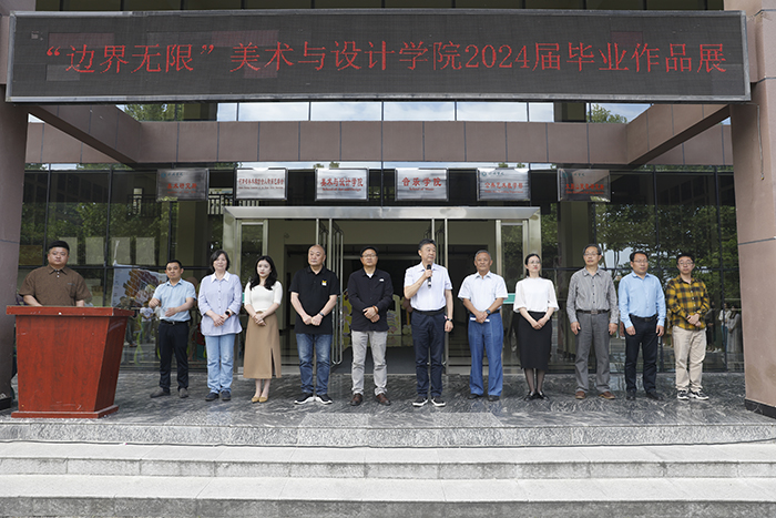 王强发表讲话。他对辛勤学习、即将学成毕业的同学们表示祝贺,向为学生们成长倾注心血的教师们致以慰问。他指出,在人工智能时代的浪潮下,美术与设计的发展应该思考如何将创意与智能科技相结合,开创新篇章。本次美术与设计学院“边界无限”毕业作品展正体现了这种思考。在这些作品里,有的同学通过研究民间艺术,挖掘传统文化内涵,用现代设计语言重新诠释;有的同学则关注社会问题,运用艺术作品提出解决方案,展现艺术的社会价值。每一份作品都是同学们对美学、对社会、对未来的独到见解和深思。他希望同学们能继续以开放的心态,拥抱变化,不断学习和探索,在人工智能时代,用美术与设计绘制出无限可能的未来。