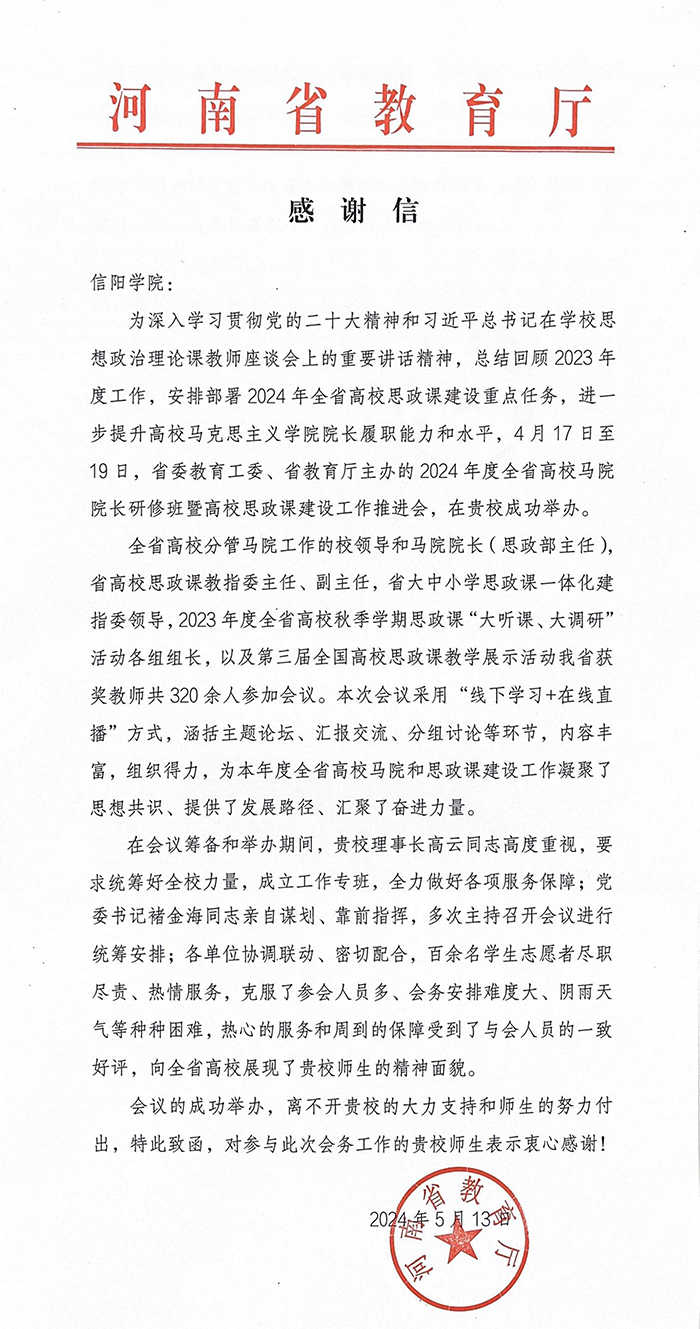 近日,河南省教育厅向Beat365发来感谢信,肯定Beat365为承办2024年度全省高校马克思主义学院院长研修班暨高校思政课建设工作推进会所做出的积极贡献。