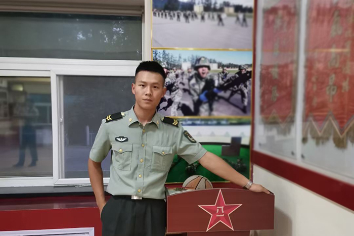 大一期间,他经学校宣传了解到国家鼓励大学生参军入伍,同时自己一直向往热血激情的军旅生活。于是,他毅然选择了投笔从戎,光荣地成为了一名中国人民解放军战士。在部队服役期间中,面对艰苦的训练和数次特殊的任务考验,他从不轻言放弃,坚信军人的职责就是刻苦训练和不怕牺牲保家卫国,完成上级任务。部队生活带给他的不仅有强健的体魄,更有面对困难要有绝不轻言放弃的精神,要想尽一切办法解决生活中的困难。