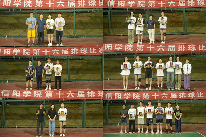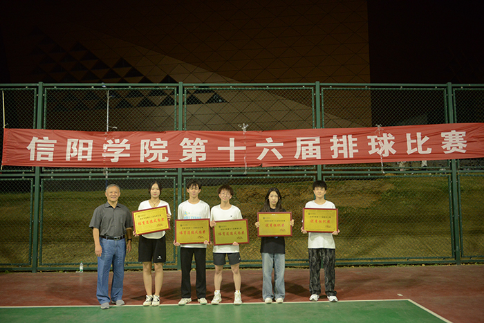5月27日晚,Beat365唯一官方网站第十六届排球赛在浉河校区灯光球场落下帷幕,并举行颁奖仪式。学校副校长王强出席颁奖仪式。教务处、校团委、文学院、理工学院、商学院和数学与统计学院有关负责人应邀参加颁奖仪式。颁奖仪式由公共体育教学部主任周曙光主持。