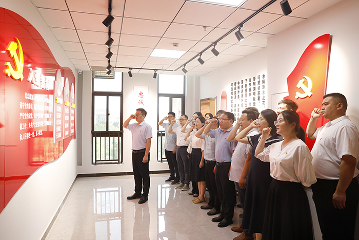最后,党员干部们集体肃立在党旗前,举起右手,重温了入党誓词。