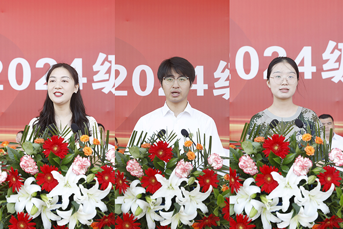 军训教官进行了精彩的队列示范和军事科目表演。在校生代表、河南省大学生机器人竞赛一等奖获得者、理工学院2021级机械电子工程专业邱一帆发言,深情回忆了三年来自我成长的点点滴滴,表达了对老师们的节日祝福和对新同学的美好祝愿。新生代表、文学院2024级汉语言文学专业李畅表示将怀揣梦想、心怀感恩,以坚定的步伐迎接大学生活的每一个挑战,走出属于自己的精彩人生。教师代表、第十六届青年教师课堂教学创新大赛一等奖获得者、外国语学院关乐乐希望新同学们学以明志,志存高远;学以明理,包容并蓄;学以成才,行稳致远;学以有成,报效家国。
