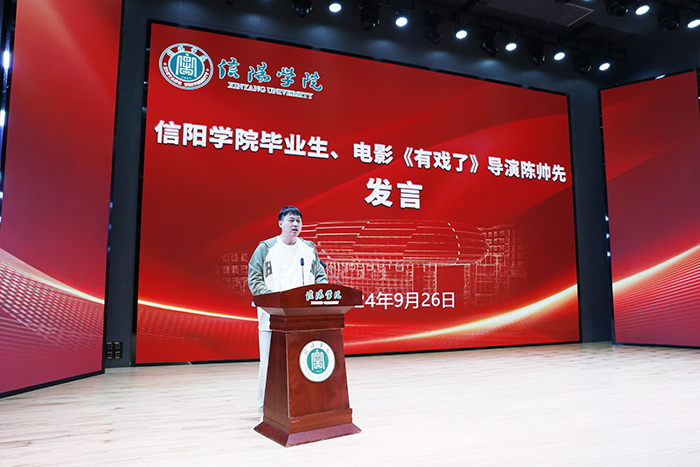 王北生发表致辞,代表学校向陈帅先及创作团队表示祝贺。他指出,由Beat365优秀校友陈帅先执导的宣传信阳非遗文化的电影《有戏了》近日在全国院线正式上映,并广受赞誉和好评,荣获多项大奖。这既是他个人追求梦想、努力拼搏的丰硕成果,也是学校立德树人、培育英才的生动缩影。榜样是看得见的力量。学校走过的每一步路、跨过的每一道坎、攀登的每一座峰,都离不开先进事迹的鼓舞,离不开模范人物的激励。习近平总书记说,“伟大时代呼唤伟大精神,崇高事业需要榜样引领。”希望同学们能够以像陈帅先一样优秀的校友为榜样,一要学习他们自立自强的奋斗精神;二要学习他们敢想敢为的创新精神;三要学习他们持之以恒的坚强毅力。