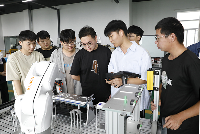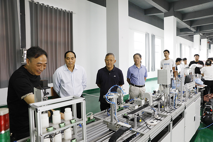 近年来,理工学院在产教融合、校企合作办学方面进行了卓有成效的探索和实践,并取得丰硕成果。9月27日,校长王北生、副校长王强深入实训中心六楼理工学院工业机器人实训中心调研指导学院产教融合工作,进一步了解企业导师进课堂和产教融合工作建设情况,教务处处长徐久成,理工学院院长肖生发、教学副院长李晓严等陪同调研。