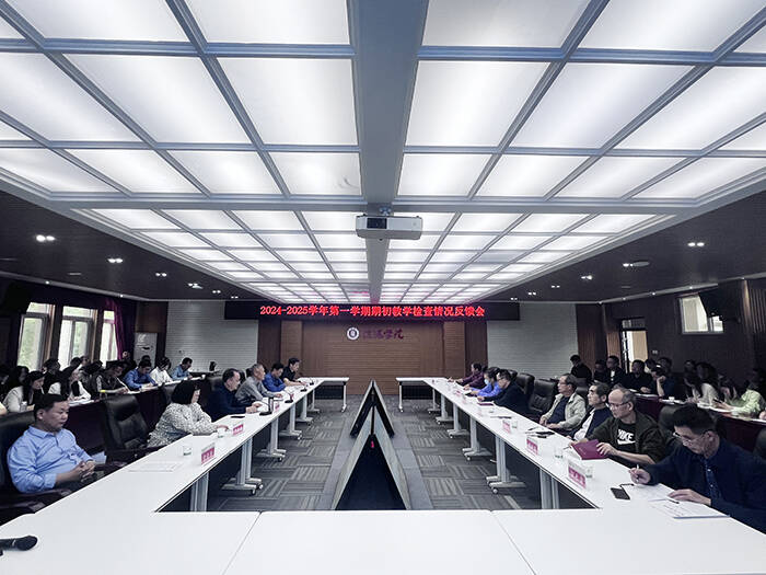教学质量监控中心主任陈文涛、文学院贾学清教授分别从新学期开课情况及教学工作计划安排、教师教学材料、教研活动、青年教师培养计划、2025届毕业生教学计划执行及核查情况、2023—2024学年第二学期期末考试试卷评阅及归档情况等方面通报了期初教学检查情况,指出各教学单位高度重视教育教学工作,取得了一定成绩,形成了各自的亮点特色,并对存在的问题进行了现场反馈。
