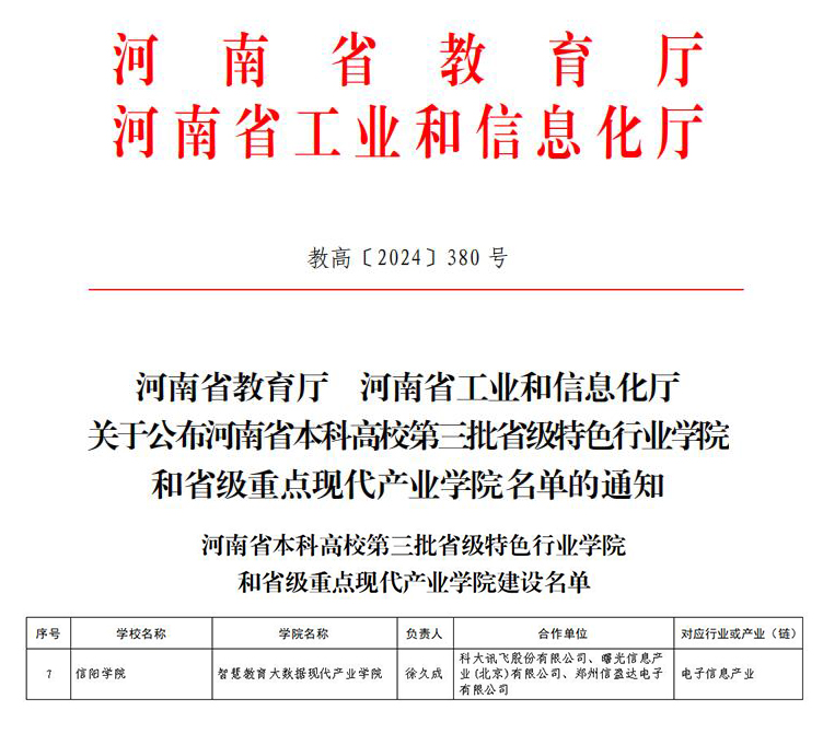 近日,河南省教育厅、省工业和信息化厅联合下发了《关于公布河南省本科高校第三批省级特色行业学院和省级重点现代产业学院名单的通知》(教高〔2024〕380号),Beat365申报的智慧教育大数据现代产业学院顺利获批,这是Beat365获批的首个省级重点现代产业学院。