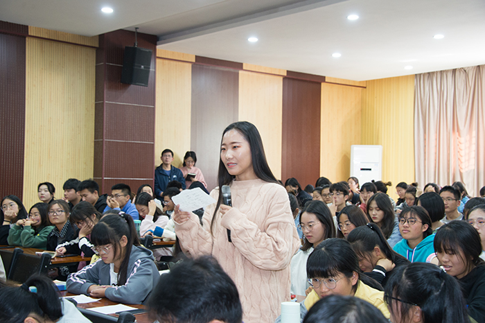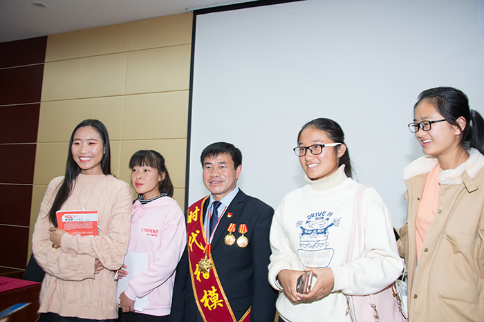张玉滚的感人事迹引起了在场党员干部师生的强烈共鸣。学生代表向他献上鲜花,表达敬佩和感激之情。教育学院的宋小玉、杨玉、王和平、韩冰、李幻格和社会科学学院的宋二龙同学纷纷与张玉滚老师进行热烈的互动问答,杨玉更是用一段感人的诗表达了对张玉滚老师的钦佩和崇敬。