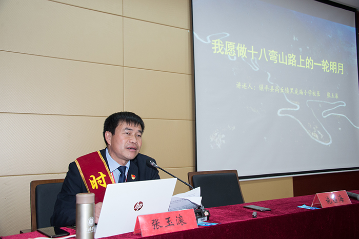 在大家的热切期盼中,张玉滚以《我愿做十八弯山路上的一轮明月》为题,用朴实的语言动情地讲述了自己扎根大山深处坚守乡村一线教师18年的心路历程和生动事例,分享了现场聆听习近平总书记在五四运动100周年大会上的重要讲话和参加国庆阅兵的喜悦心情。他为了山区的教育事业,用扁担挑书、在食堂做饭;为保护孩子们的新书不被雨水淋湿,在寒冷黑暗的山洞里度过通宵;冒着生命危险从危房中将村里的爷孙俩救出;为了更好地照顾孩子们,练就了“拿起教鞭能上课,掂起勺子能做饭,捏起针线能缝补,打开药箱能治病”一身本领;学校教师不足,把自己磨练成为一名“全能老师”,千方百计上好每一节课。一桩桩爱护学生、精心教学、默默坚守的感人事迹,饱含深情,令人动容。他用自己的身心奉献山村教育事业,用一根根扁担挑起孩子们走出大山的希望,是新时代“四有”好教师的典范,是共产党员“不忘初心、牢记使命”的标杆。他表示要继续做一个挑山工,矢志不移;做一名躬耕者,执着坚守;做一个守望人,快乐前行;做一名筑梦匠,薪火相传。