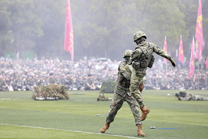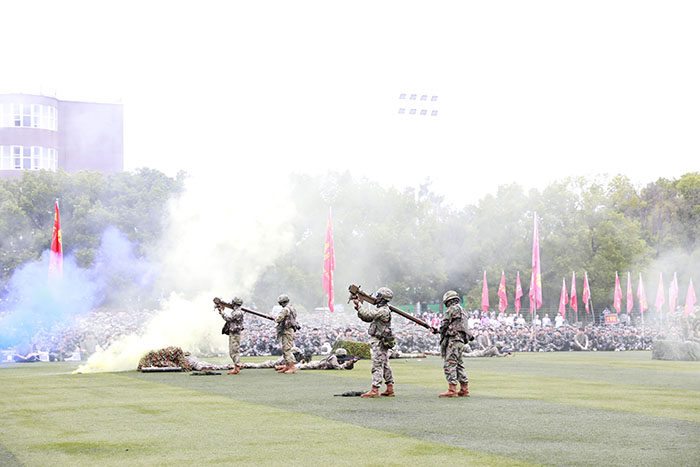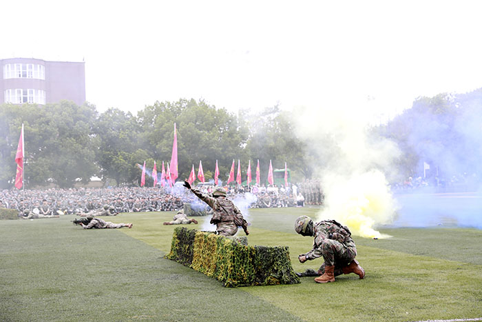 军训教官进行了精彩的队列示范和军事科目表演。