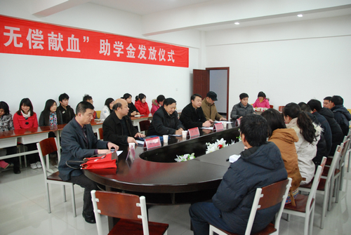 12月20日下午,信阳市中心血站“无偿献血”助学金发放仪式在图书馆五楼会议室举行。信阳市卫生局副局长李萌、中心血站站长黄贤威、中心血站副站长李汉中、我院副院长王志华、办公室主任张柏平、学工部副部长、团委书记李明及各系辅导员和受资助全体学生参加了发放仪式。仪式由李明主持。
