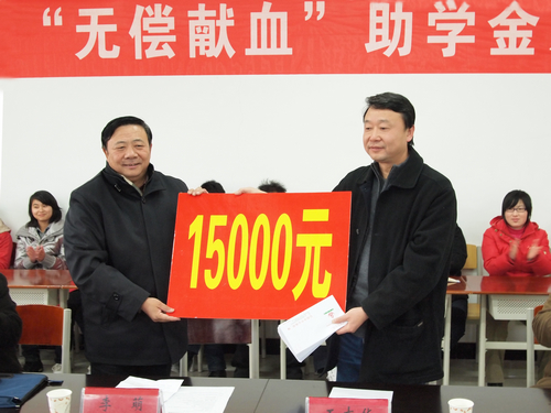 仪式上,王志华代表学校接收了资助款并讲话,他对信阳市卫生局、信阳市中心血站为我院30名品学兼优、经济困难学生送来温暖表示衷心的感谢。他指出,无偿献血是每位公民的义务,也是传播爱心的重要体现。他勉励受资助同学珍惜此次“无偿献血”助学金的资助,更加刻苦学习,取得优异成绩;更加积极主动的参加社会实践活动,在社会实践中培养道德水准、爱心、感恩的心、增强社会责任感;在大学四年努力学习专业知识,提高自己的科学文化素质和道德修养,做一个德、智、体、美全面发展的优秀大学生,为社会做出应有的贡献。