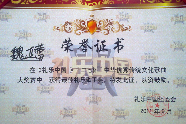 据悉,“礼乐中国”中华优秀传统文化歌曲大赛是由中国老龄事业发展基金会、孝文化传播基金管理委员会、河南电视台、河南省音乐家协会、河南省孝文化促进会、郑州市二七区政府、郑州市二七区精神文明建设指导委员会主办,二七区辖区部分企业积极协办的一个为弘扬中华优秀传统文化的公益性唱歌比赛。魏亚蕾同学经过层层选拔入围全国60强,并最终获得“最佳礼乐歌手奖”。