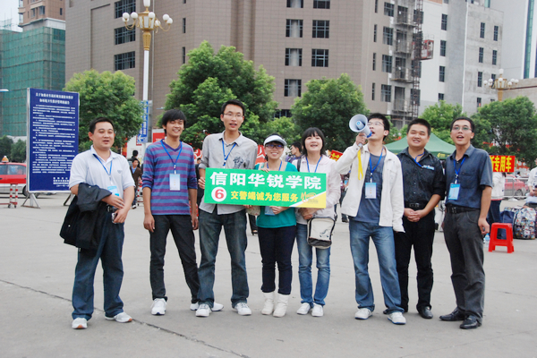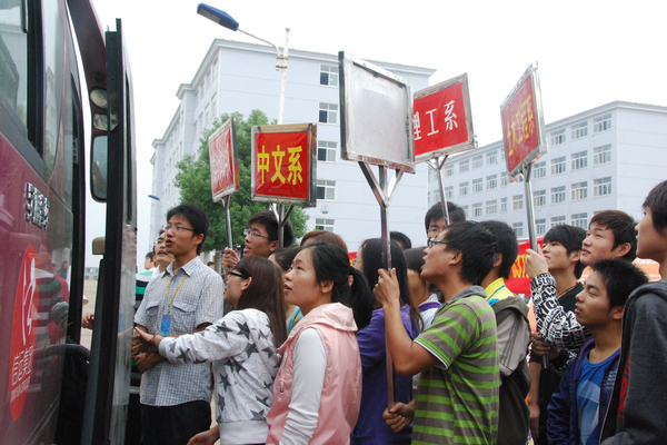 校园里彩旗飘扬,条幅高悬,现场一片忙碌的景象,处处显现出亲切、热烈、喜庆的气氛。校门内外川流不息,满载新生的迎新车一辆接一辆,新生及迎新人员的人流汇成了人的海洋。学生一餐厅西操场前,各系一字排开,迎新车一到,负责迎接新生的高年级同学立即迎上前去,帮助新生和家长提行李,带领新生报到、缴费等,并耐心解答家长的问题。他们的热情接待和周到服务得到了新生及家长的一致称赞。