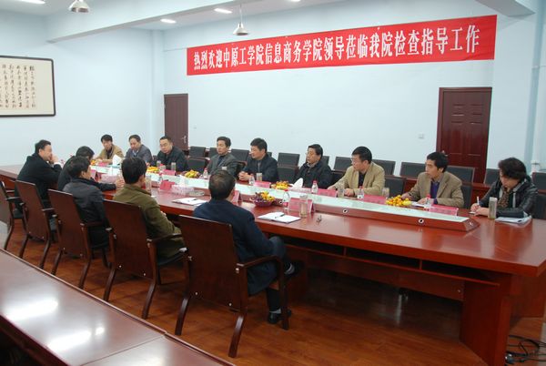 11月17日,中原工学院副院长、信息商务学院院长、书记黄乾,信息商务学院副院长刘登义,组织人事处处长杨子卿,办公室主任杨保国,教务科技处处长赵志泉,学生工作处处长于永民,后勤保障处处长王孟强,督导室主任范文捷,教务科技处副处长卜伟刚一行九人来我院考察交流工作。信阳师范学院副院长、我院副董事长李俊,我院院长郑定豪,党委书记祝军,副院长王志华、王忠阁、高云等出席座谈,陪同参观校园。双方就学士学位授予单位评审、迎接教育部考察验收等事项进行了深入交流。