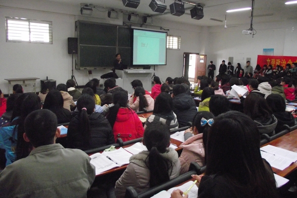 丁老师以四、六级考试听力训练为切入点,建议学生多听、多练,做到听与写的结合;在写作方面,丁老师结合其多年评卷经验指导学生,要杜绝照抄阅读理解内容,要运用特殊句型打造作文亮点,将长短句搭配使用提高作文得分点。他还以2011年12月份的四级考试真题为例,详细讲解了阅读理解部分的做题思路、做题技巧及训练重点。