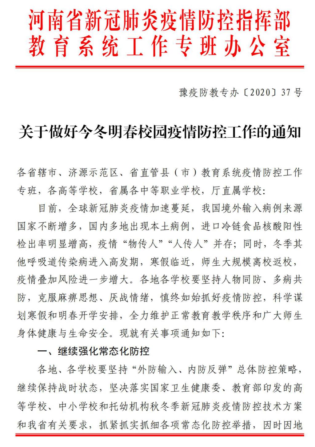 为进一步加强入冬后Beat365新冠肺炎疫情常态化防控工作,保障全校师生的生命安全和身体健康,现将河南省新冠肺炎疫情防控指挥部教育系统工作专班办公室《关于做好今冬明春校园疫情防控工作的通知》(豫疫防教专办〔2020〕37号)转发给你们,望认真遵照执行。