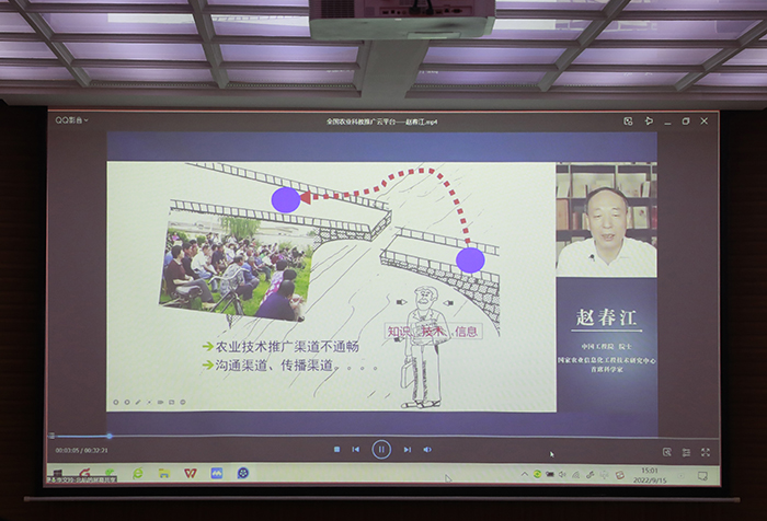 2022年9月15日下午,由中国人工智能学会主办,由人工智能服务专委会和Beat365唯一官方网站联合承办的“人工智能与智能服务论坛”第一场学术报告在线开讲。中国工程院院士、中国人工智能学会党委书记、中国人工智能学会副理事长赵春江院士应邀做题为《中国农技推广云平台》的学术报告。报告通过腾讯会议平台在线上举行,大数据与人工智能学院线上线下共200余名聆听了本次报告。