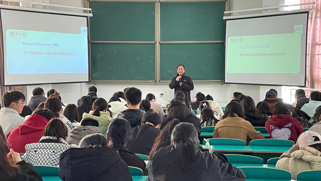 2月27日下午,华南理工大学博士生导师郑驻军教授在数计楼208教室为学院师生作了题为“量子信息基础及技术前沿”的学术报告。数学与统计学院院长俞迎达、党总支书记刘颖方、副院长张聪和200余名师生一同聆听了报告。俞迎达主持了报告。