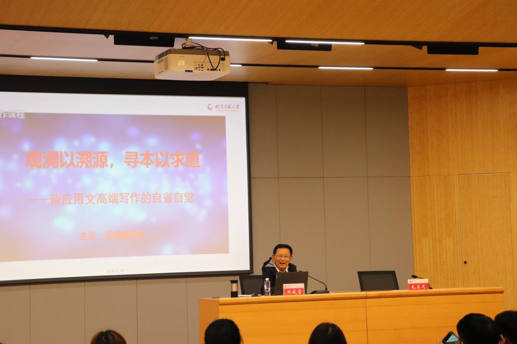 为提高学生应用文写作水平,创作优秀作品,4月21日上午10∶00文学院在图书馆101教室开展南山学术论坛第三十八讲。特邀湖北大学教授、国际汉语应用与写作学会常务副会长、国家社科基金盲评专家、国家公务考试题库命题专家洪威雷讲学。本次讲座题为《观澜以溯源,寻本以求道——高端写作漫谈》,文学院院长毛正天及部分师生聆听了本次讲座。讲座由文学院院长毛正天主持。