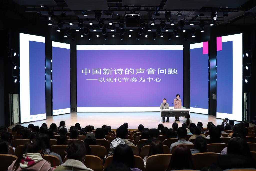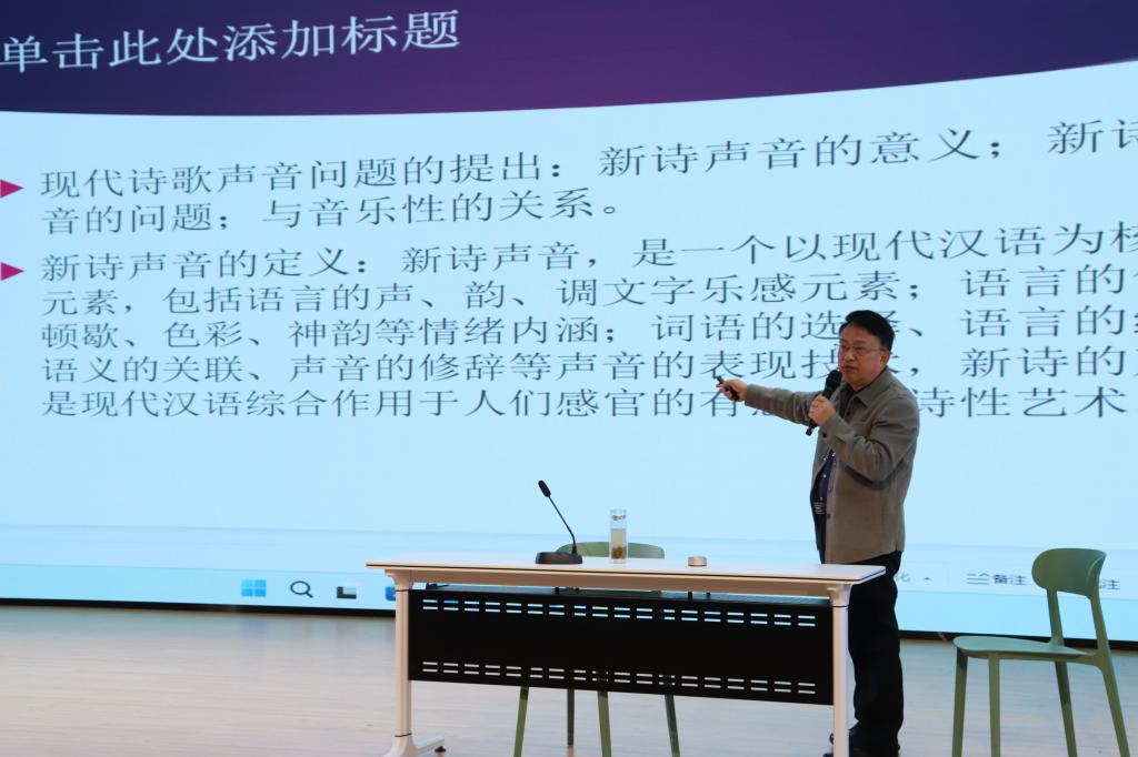 王教授高度赞扬了学院的学习环境和学习氛围。他认为,诗歌作为一种教育方式不仅仅是一种文化教育,更是一种人格教育,也是一种成长教育,是古时读书人的基本功,其远远超出了文学教育的范畴。王教授为在座师生详细介绍了诗歌的由来演变,古代诗歌教育因受传播方式所限比较依赖言传身教的方式传播,这就造成诗歌尤其讲究声音的特点,而最早在文学艺术启蒙的时候,诗歌是辅助唱歌的副产品,发展到后来,诗歌脱离音乐自成一派,因此诗歌身上具有音乐的痕迹。然而由于古代诗歌深受格律所限,诗人不能充分地表情达意,所以现当代诗人不断寻求诗歌体裁的突破。王教授由此提出了“我们新诗的声音究竟发生了些现代型转变”“新诗声音的理论思考与实践出现了什么样的问题”“如何重建新诗的声音理论与实践路径”等一系列问题,表示新诗急需破格与突破,急需寻找新的声音。