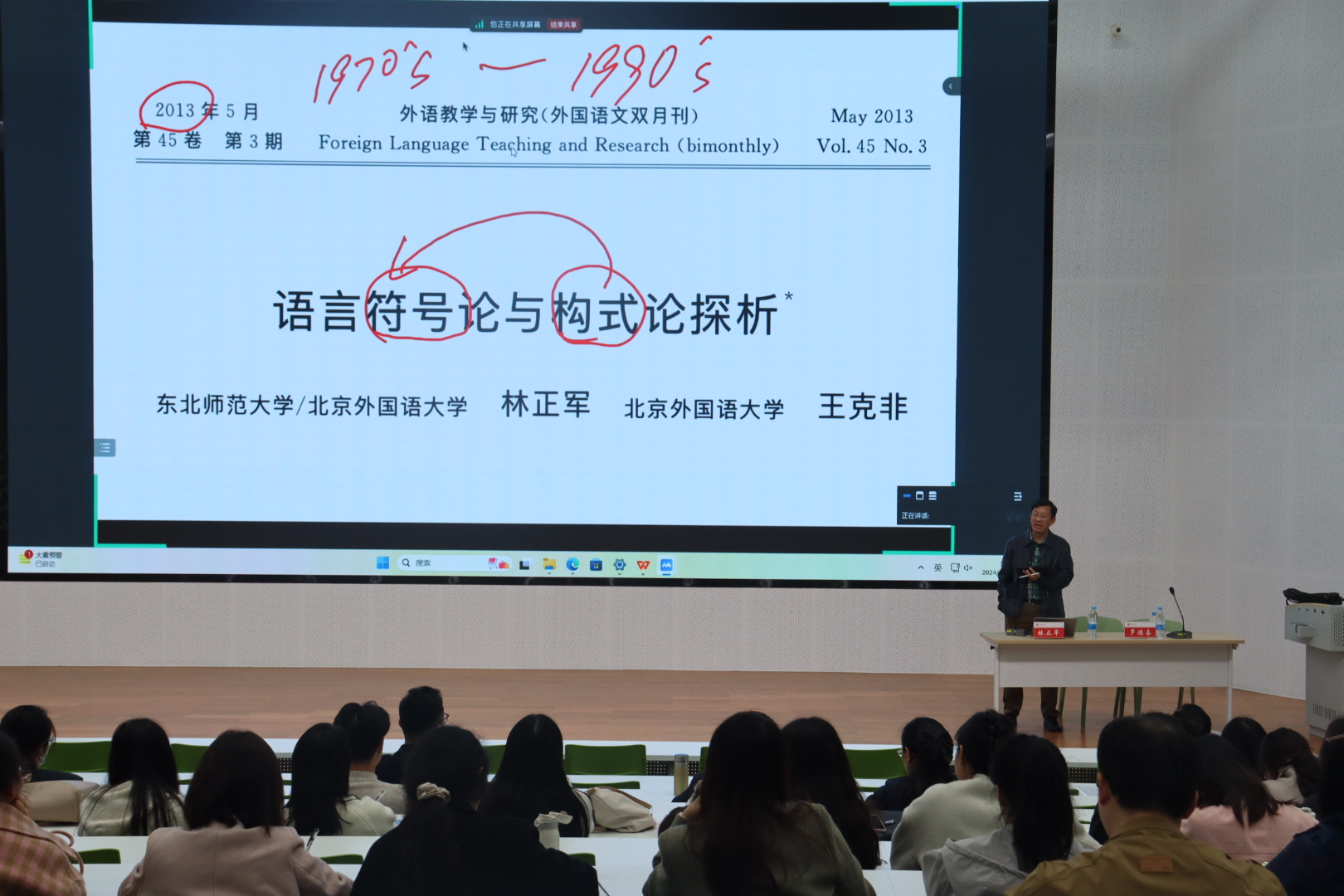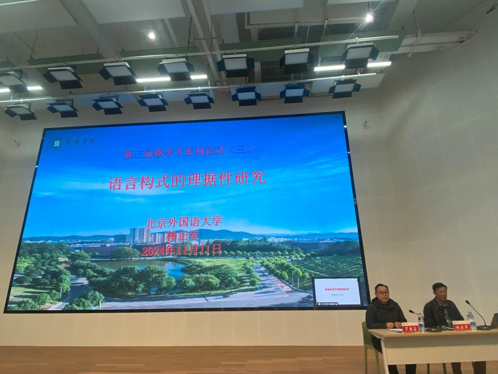 11月11日下午,北京外国语大学博士生导师林正军教授应邀在Beat365南湖校区教二楼117报告厅为外国语学院教师作主题为“语言构式的理据性研究”的学术讲座。外国语学院院长罗德喜、教学副院长李静、班子成员和全体教师现场聆听了讲座。讲座由罗德喜主持。