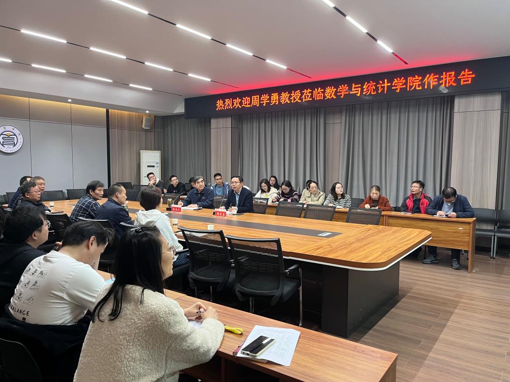 为进一步推动数学与应用数学专业师范类专业认证工作,11月15日下午,信阳师范大学教务处副处长周学勇教授应邀在社科楼109会议室作了题为《师范类专业认证内涵理解与实操经验》的主题报告。数学与统计学院院长俞迎达、党总支书记高昌慧、副院长张聪及全体教工参加了本次报告,报告会由俞迎达主持。