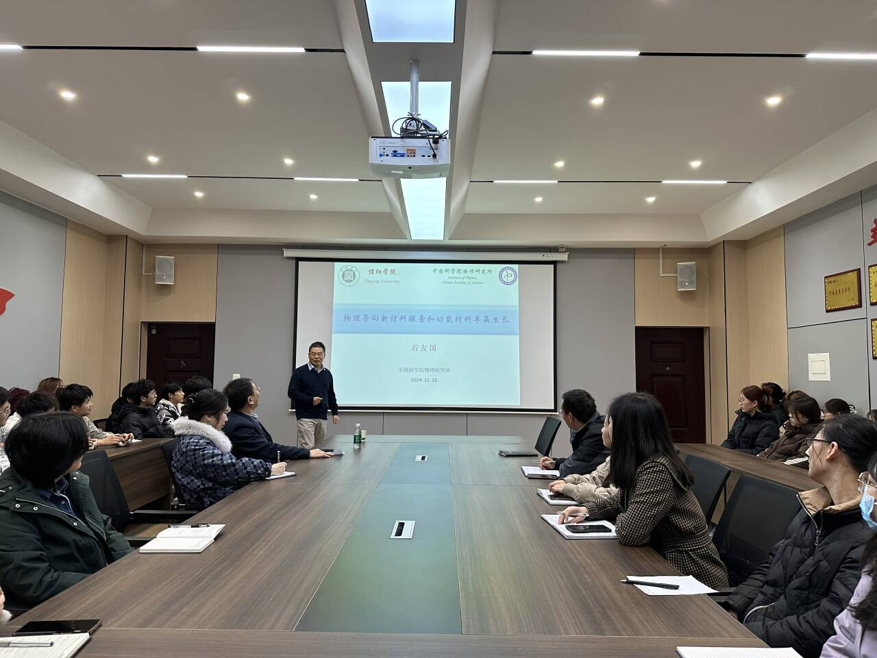 石友国教授结合自己在国内外进行的科研工作和合作实践,深入介绍了各类新型物理导向材料(如5d锇体系、重费米子体系等)的探索,以及功能材料单晶生长(拓扑材料、自旋液体材料等)规律,并进行电输运、磁学、谱学等的性能测试和理论计算等。报告内容详实,具有很强的科学性、前沿性和启发性,为提升学科人才培养质量、团队协作、项目申报、科研创新等方面提供了很好的指导与借鉴。
