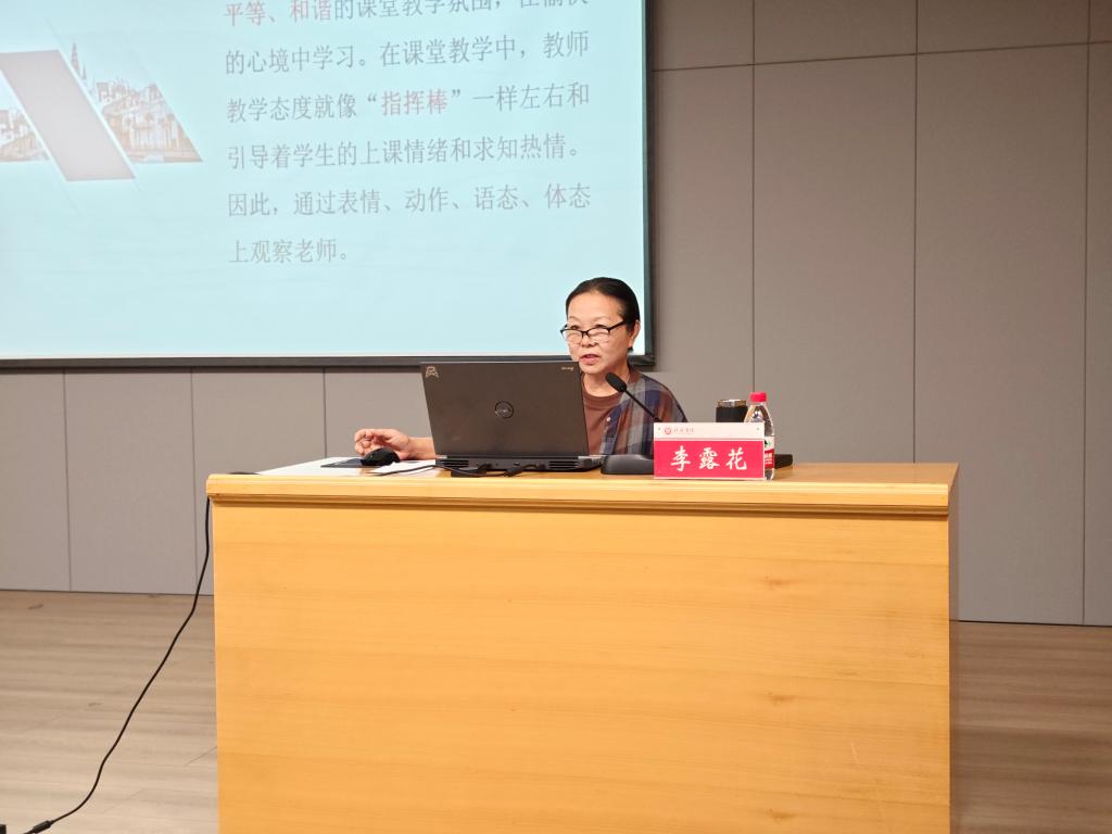 李露花在讲座中以“教育是慢的艺术”开篇,解读了什么是美育、美育何为等内容。她强调课堂要讲求创新,把备课当做研究来钻研,要坚持成果导向,让学生把作业当做创作来完成。她结合“观察-感受-表达”三步教学法案例,强调从生活场景和地域文化挖掘教学资源,结合不同学段学生的特点和成长经历设计教学。要将美术课堂与我国重大社会热点相结合,引导学生关注热点,理解文化,建立正确的价值观念,坚定文化自信。李老师结合具体的课例,就如何调动学生课堂参与的积极性等分享了自己的独特做法。