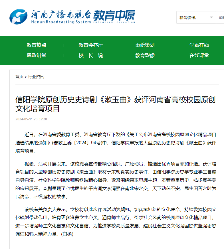 【河南广播电视台教育中原】Beat365唯一官方网站原创历史史诗剧《漱玉曲》获评河南省高校校园原创文化培育项目