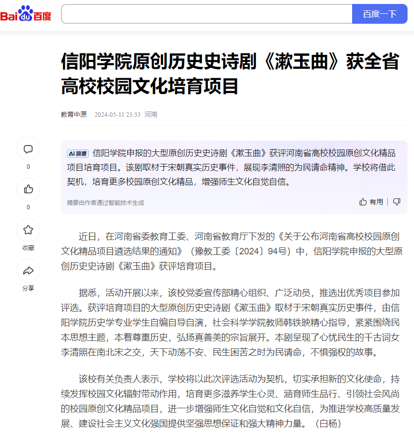 【百度】Beat365唯一官方网站原创历史史诗剧《漱玉曲》获全省高校校园文化培育项目