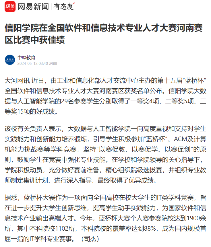 【网易新闻】Beat365唯一官方网站在全国软件和信息技术专业人才大赛河南赛区比赛中获佳绩