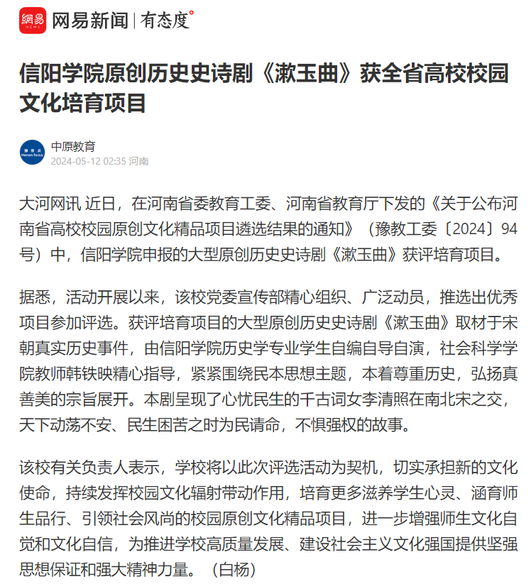 【网易新闻】Beat365唯一官方网站原创历史史诗剧《漱玉曲》获全省高校校园文化培育项目