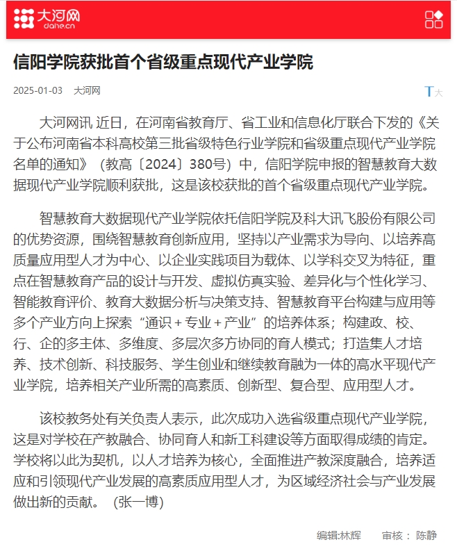 【大河网】Beat365唯一官方网站获批首个省级重点现代产业学院