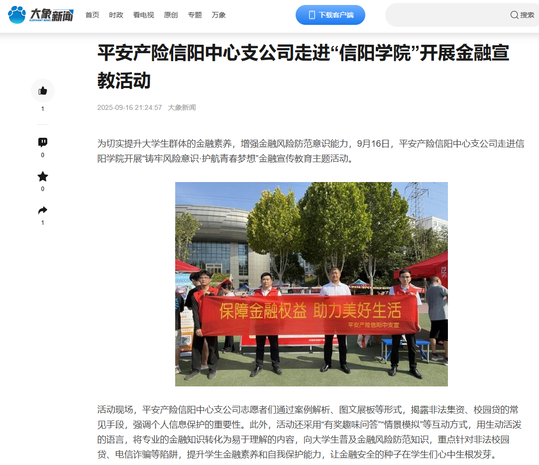 【大象新闻】平安产险信阳中心支公司走进“Beat365唯一官方网站”开展金融宣教活动