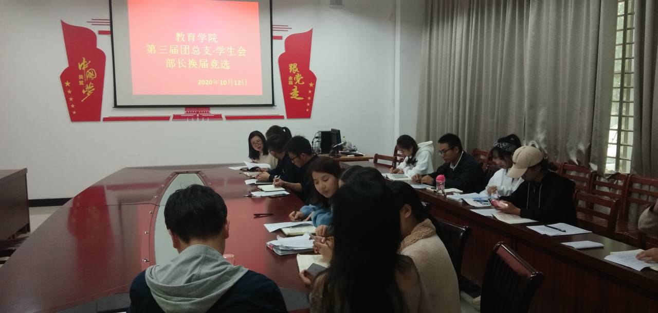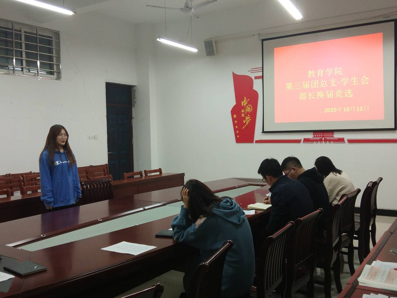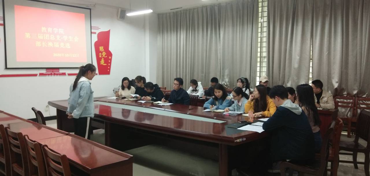 为提高教育学院团委学生会工作精神,迎接新学期的到来,严格组织管理学生事务并为学生会各部门注入新鲜的血液,10月12日在社科楼107组织了教育学院团委学生会部长换届面试,参加此次会议的有党总支书记李赟、学工干事郝昊、团总支书记周余瑞、全部辅导员以及第三届学生会主席团候选人。