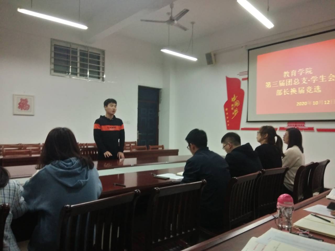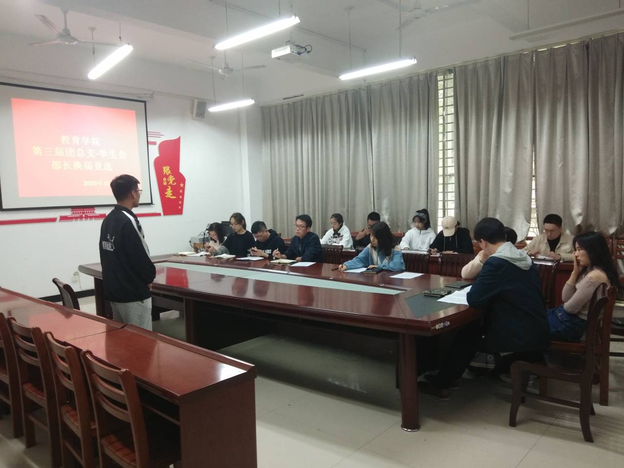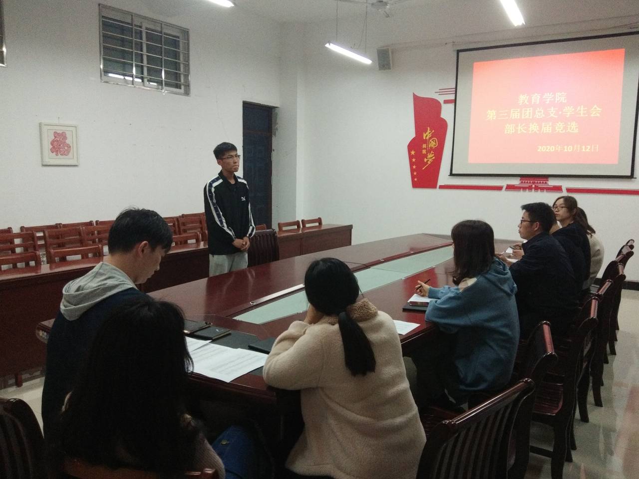 为提高教育学院团委学生会工作精神,迎接新学期的到来,严格组织管理学生事务并为学生会各部门注入新鲜的血液,10月12日在社科楼107组织了教育学院团委学生会部长换届面试,参加此次会议的有党总支书记李赟、学工干事郝昊、团总支书记周余瑞、全部辅导员以及第三届学生会主席团候选人。