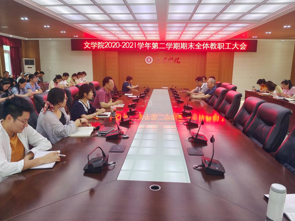 6月22日,我院在人文楼208召开文学院2020—2021学年第二学期期末全体教职工大会,文学院院长毛正天,教学副院长黄亚妮,行政秘书陈俊以及文学院全体教职工参加此次会议。会议由毛正天主持。