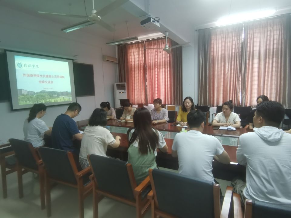 7月1日上午,外国语学院在外语楼110会议室召开全员德育导师制经验交流会。出席本次会议的有外国语学院党总支副书记程娇炎、学工干事刘阳红以及外国语学院生活导师代表。
