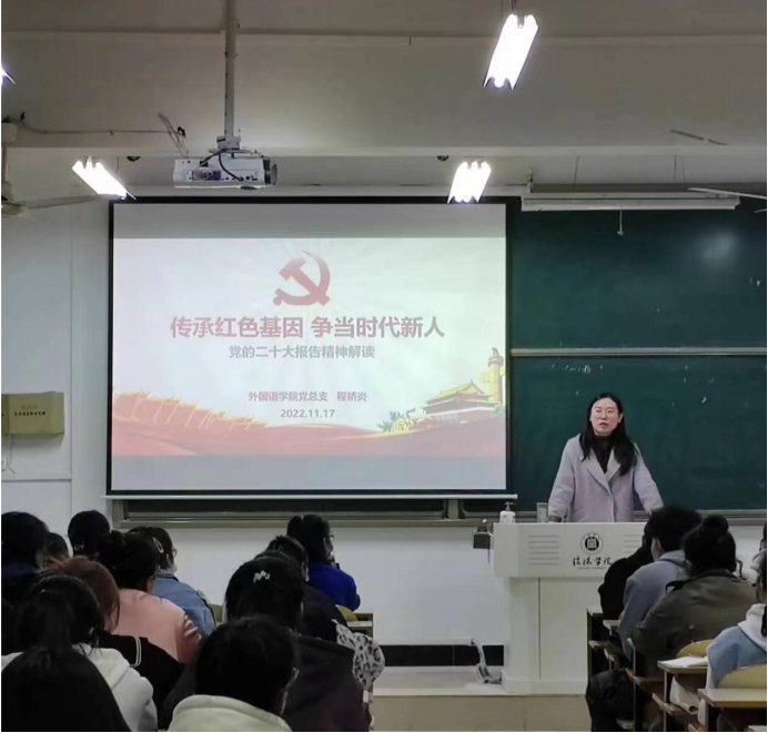 11月17日晚,外国语学院党总支副书记程娇炎在外国语学院302教室开展2022年下半年积极分子“传承红色基因 争当时代新人”的主题党课。