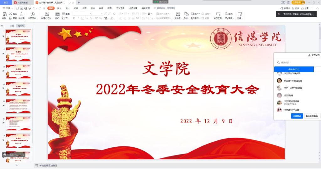 为提高学生的安全防范意识,增强学生的安全防范能力,创造和谐安全的生活环境,12月9号下午,文学院召开2022年冬季安全教育大会,文学院党总支书记李赟、学工秘书徐远东、文学院全体辅导员、文学院各班班长及团支书参加了此次会议。本次会议由学工秘书徐远东主持。