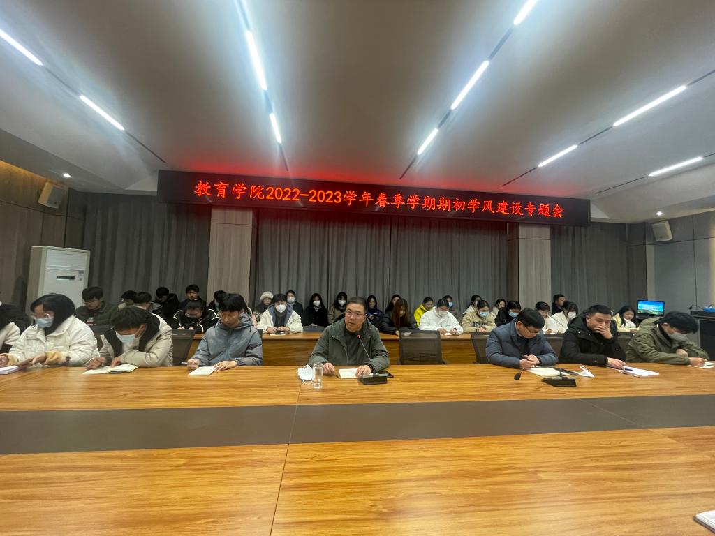 为创建优良学风班风,推动学院学风建设“高质量发展”,学院于2023年2月12日下午,在社科楼109会议室召开了新学期学风建设专题工作会,教育学院党总支书记张甲楠、学工干事郝昊、全体辅导员及各年级班长、学委参加了本次会议,会议由郝昊主持。
