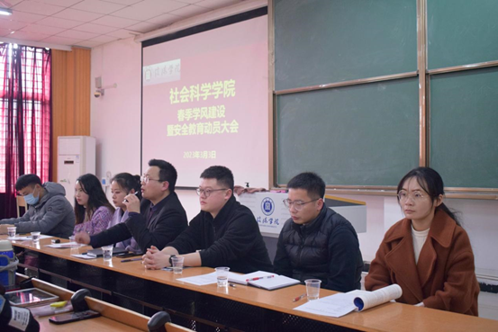 3月3日中午,社会科学学院在社科楼219教室召开春季学风建设暨安全教育动员大会。党总支副书记胡志国、学工干事陈苗苗、全体辅导员、第十五届团总支学生会全体成员和2020、2021、2022级班长、团支书参会。会议由陈苗苗老师主持。