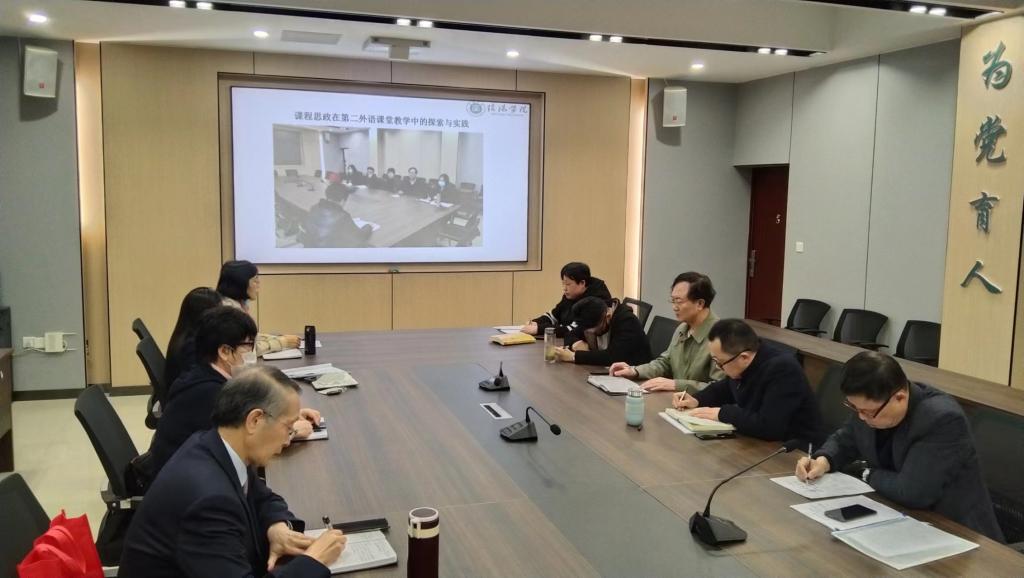 3月14日下午,外国语学院第二外语教研室全体老师在外语楼110会议室展开以“课程思政在第二外语课堂教学中的探索与实践”为主题的教研活动。外国语学院院长罗德喜、副院长李静、督导专家何杰英、韩保宪和第二外语教研室全体教师参加了本次活动。活动由第二外语教研室主任李小莉主持。